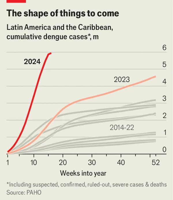 For the second time in five years, Brazil’s army is building field hospitals in the capital, Brasília. The tents are accommodating a surge of patients from swamped emergency departments, as millions of Brazilians succumb to dengue fever that is spreading across the country. As with covid-19, the last disease to prompt the construction of field hospitals, many dengue infections are asymptomatic. The one-in-four people who do fall ill can suffer for several weeks with a painful condition known as break-bone fever. Unlike covid-19, the virus causing this wave of illness is carried by mosquitoes. As the climate warms, their range is expanding and the number of people they infect is increasing (see charts).